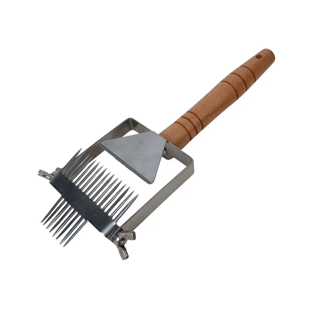 Ergonomiskt utformad avtäckningsgaffel med justeringsmöjligheter tillverkad i trä och rostfritt stål. Själva gaffeln är justerbar med hjälp av vingmuttrar. Ergonomiskt utformad och försedd med handtag av trä.Denna avtäckningsgaffel är konstruerad så att man drar den över ramen istället för att föra den framåt. Genom att låta bladet ligga an mot täckvaxet drar man avtäckningsgaffeln bakåt över ramen så att gaffeln lyfter bort täckvaxet.