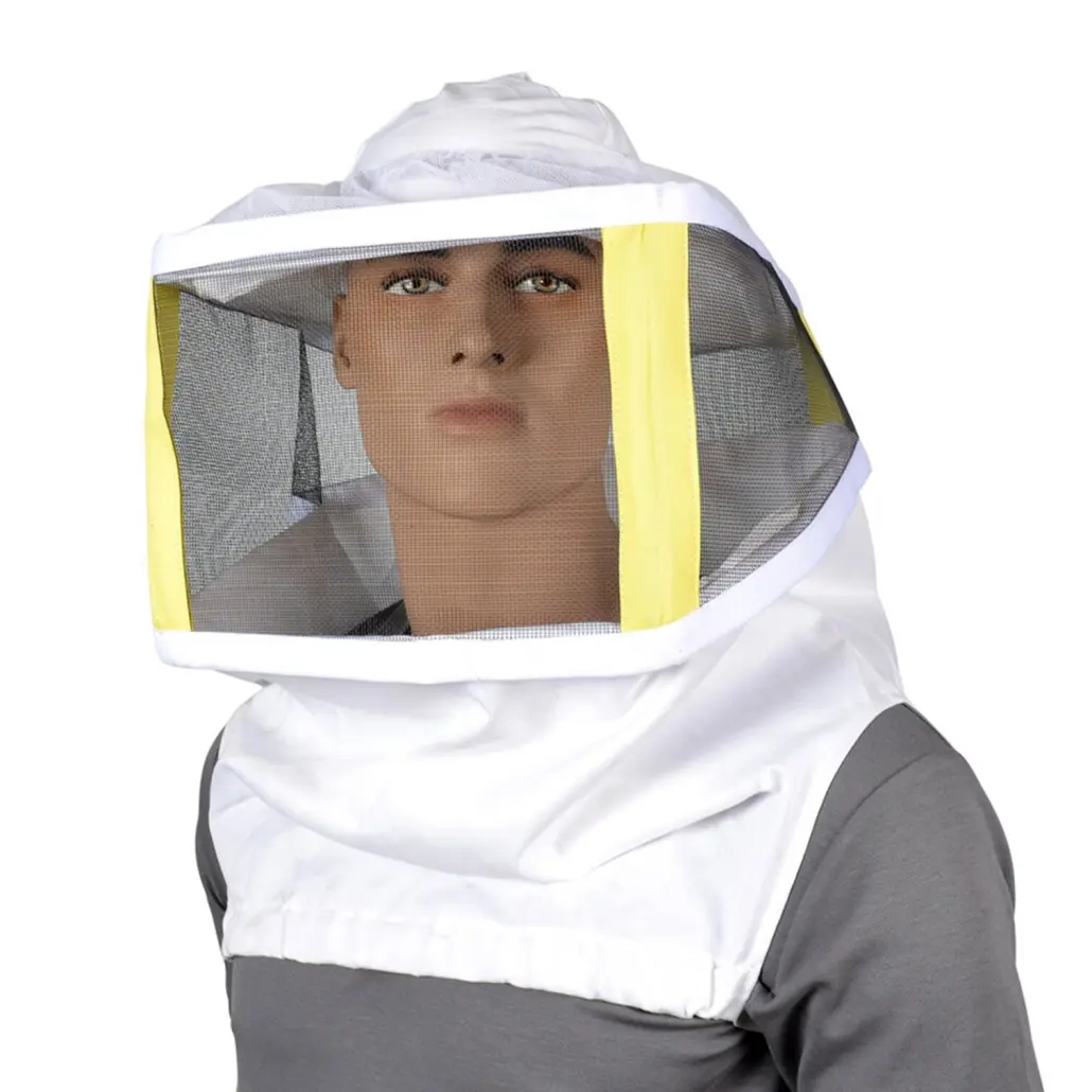Vit fyrkantig bihuva i två delar tillverkad i bomull och nylon med bred hatt/skärm som ger stort synfält. Enkelt plagg för att skydda ansikte och hals från bistick. Lätt att ta på och av. Huvan är förstärkt med metallskenor för bättre stabilitet.Bihuvan går ner till bröstet och är försedd med elastiska ärmgenomföringar som håller huvan på plats. Luftig passform. Enklare skyddsklädsel lämplig för besökare eller mindre krävande uppgifter i bigården. Tvättbar i 40 grader.