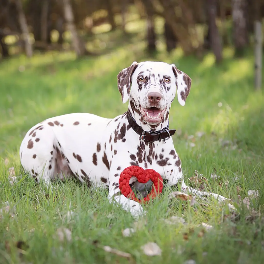 Hundleksak tillverkad av bomullsrep i from av ett lekfullt hjärta. 15 x 14 cm
