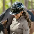 Ridhjälm med implementerat Mips-system. Elegant glansig hjälm med bred solskärm och gnistrande glittrande panel samt vackert glitterband runt skärmen. Designad med totalt sex ventilationsöppningar. Justerbart hakband i exklusivt brunt konstläder med trepunktsfästen samt snabbspänne. För optimal passform justeras storleken enkelt baktill med hjälp av rattsystemet. Avtagbart innerfoder av Cooldry-material, som torkar snabbt och håller huvudet svalt. Tillverkad av premium polykarbonat och utrustad med innovativt integrerat nässkydd. Godkänd enligt Mips, CE samt standard EN1384:2023.