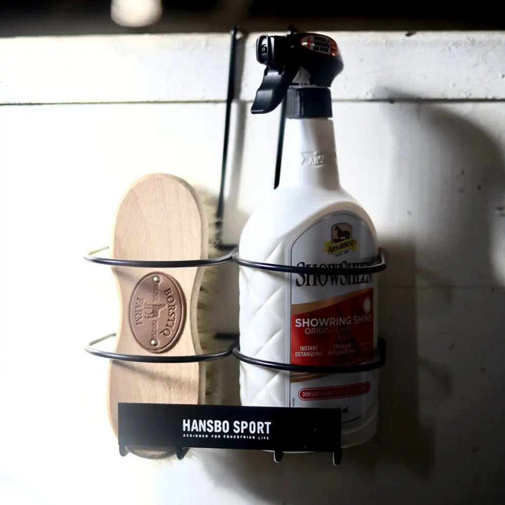 Portabel sprayflaskhållare som passar över boxar, staket och grindar. Optimal förvaring för pälsglans, schampo eller sommarspray som behöver vara lättillgängliga stallgången, duschspiltan eller ute vid hagen.