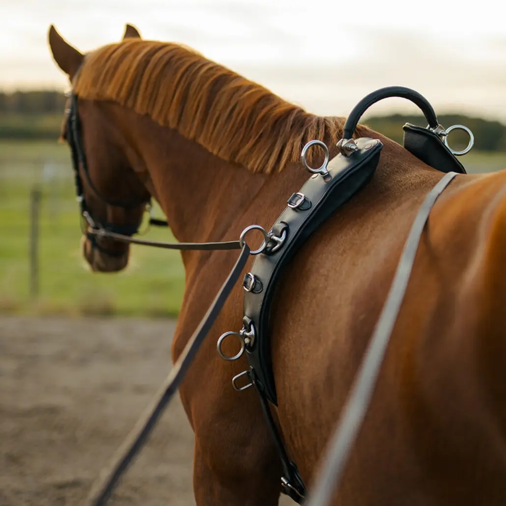 Exklusiv och prisvärd tömkörningsgjord med båge. Anatomiskt utformad för att ge hästen optimal rörelsefrihet och komfort. Designad med silverfärgade beslag, tre ringar och tre mindre kvadratiska ringar på vardera sida. Ledad däckel. Levereras komplett med bukgjord.